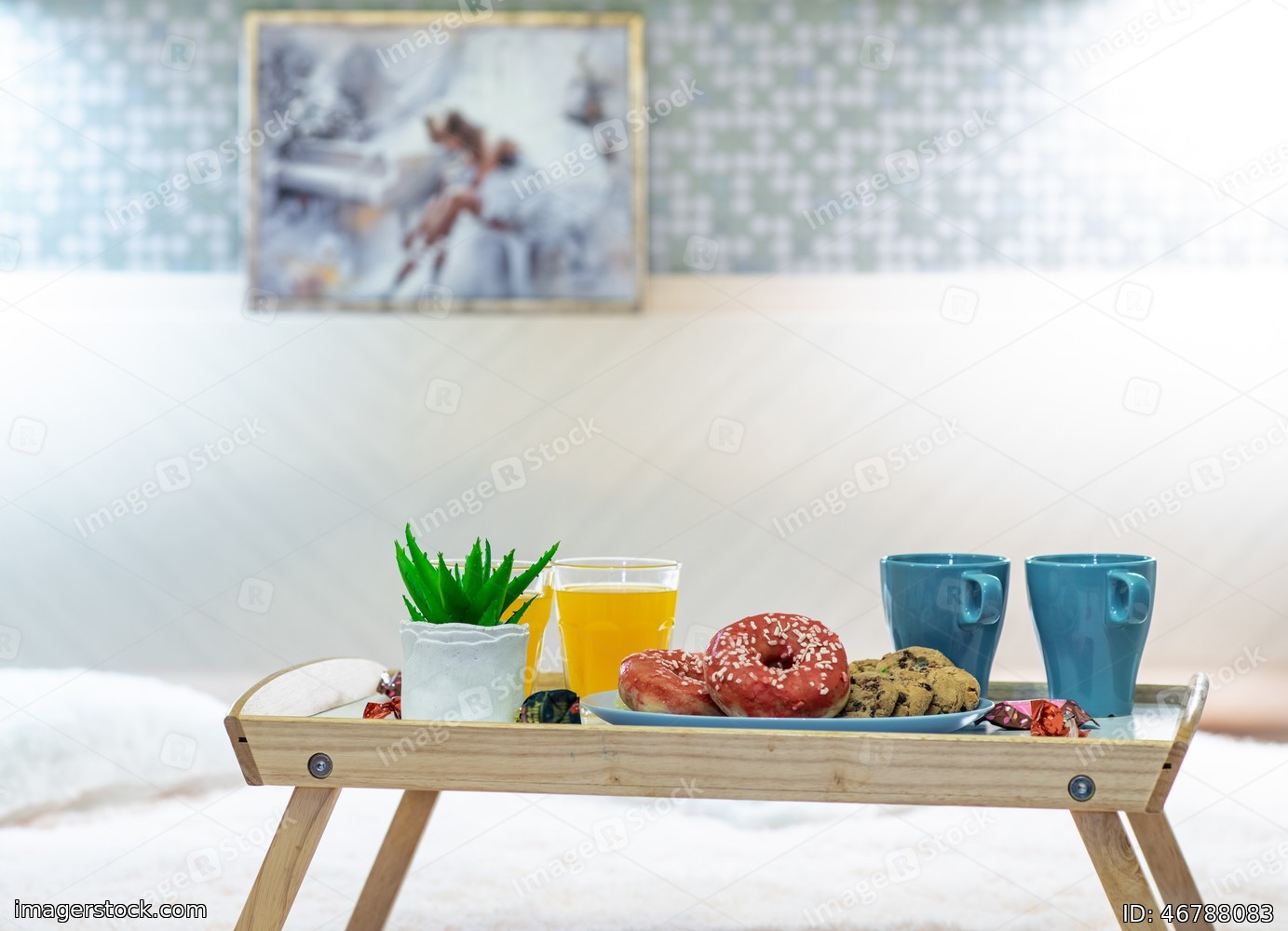 Close-up of tray with food. Romantic breakfast composition.