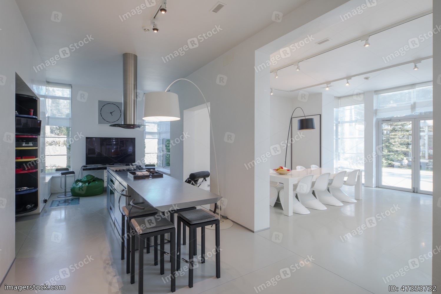 Modern white interior of spacious private house. Kitchen dinner room.
