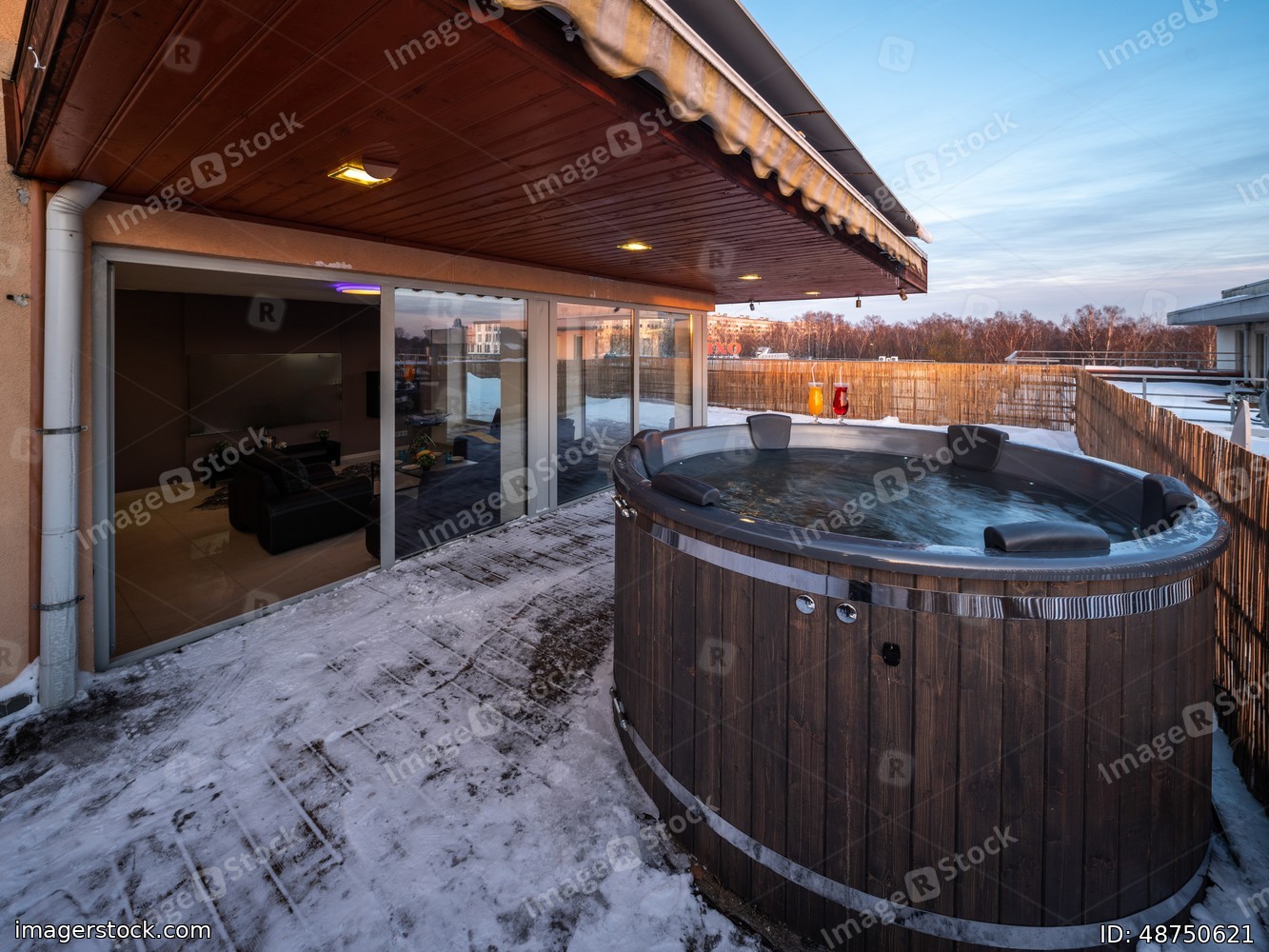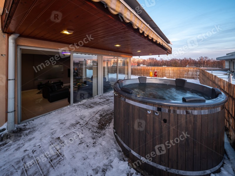 Open terrace with hot outdoor wooden bath tub. Luxury private house.