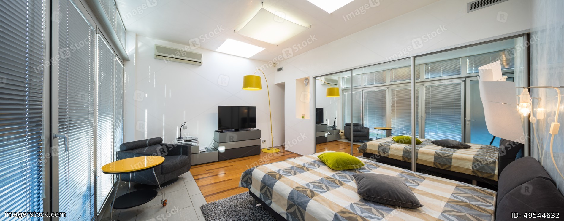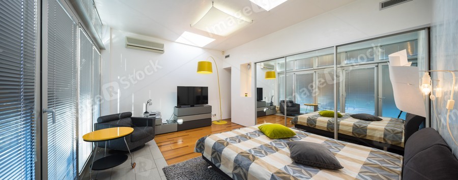 Modern interior of bedroom in apartment. Sliding mirror door wardrobe