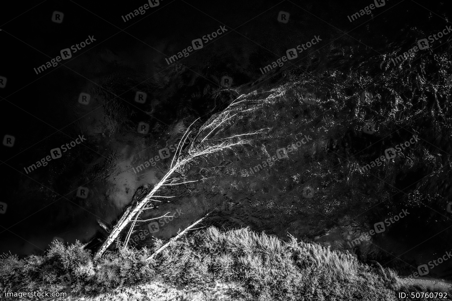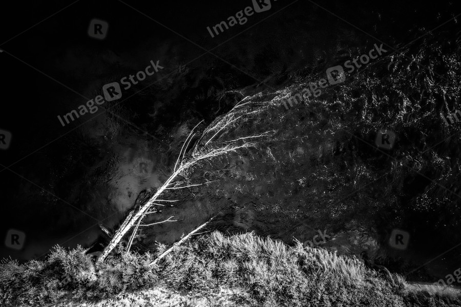 Black and white drone landscape. Dry tree has fallen and lies in the fast flow of the river on the shore.