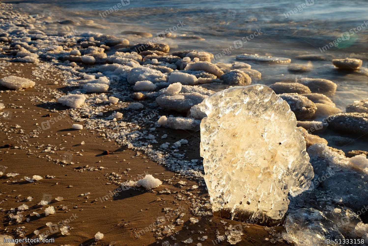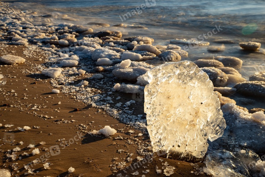 Close-up of piece of ice on snowy beach of Baltic sea at winter.