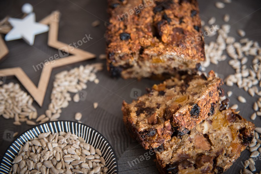 Homemade fruit bread with cosy winter decorations
