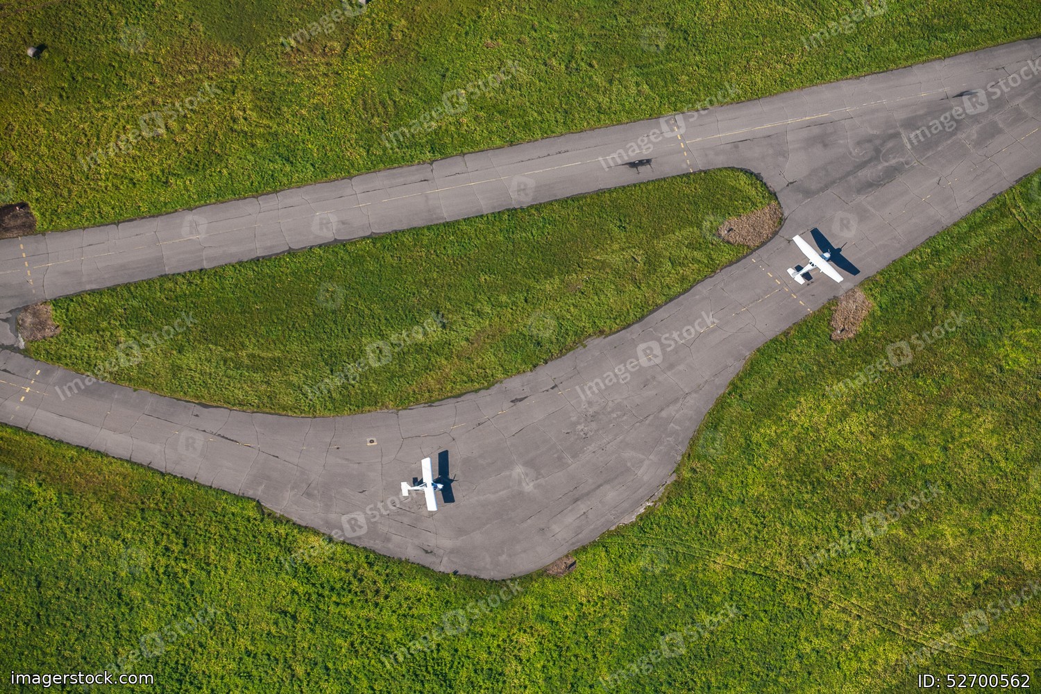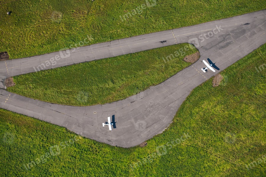 Aerodrome, runway, small aircraft. Aerial view.