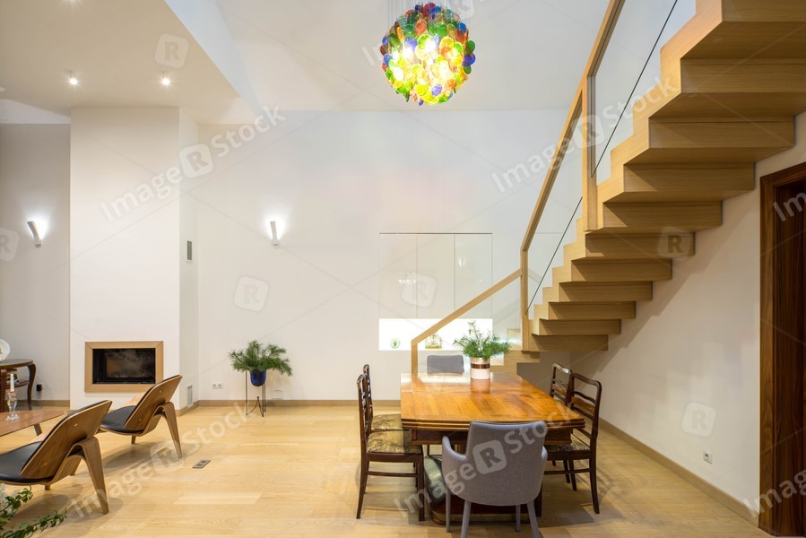 Light interior of room in private house. Wooden staircase, table and chairs. Chandelier. Black fireplace.