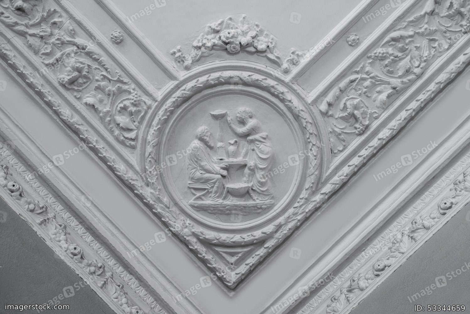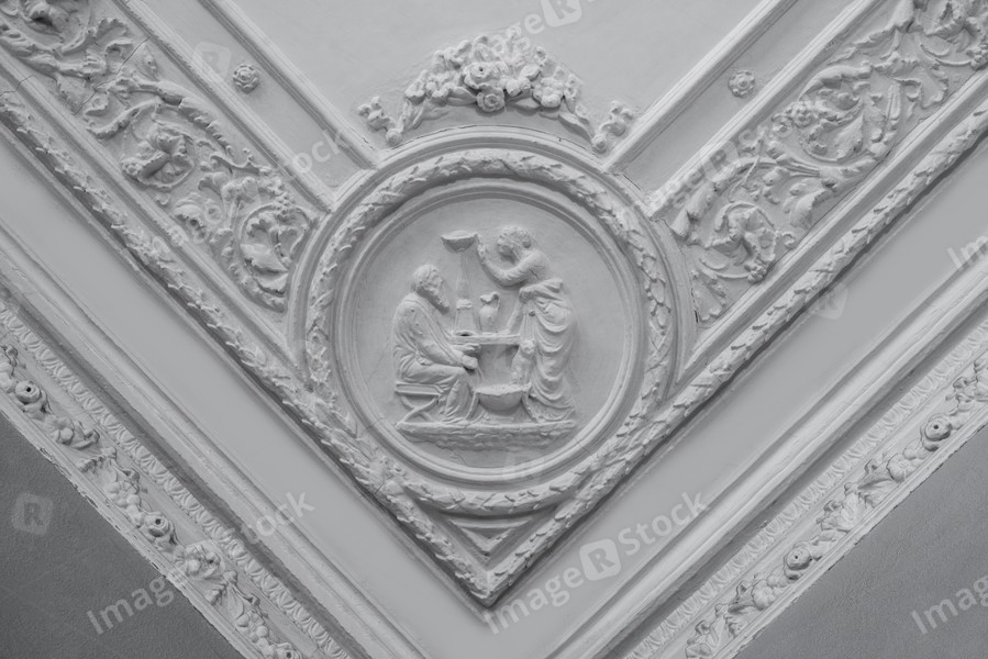 Retro moldings on the ceiling around the room. The old gypsum rosette on the celling.