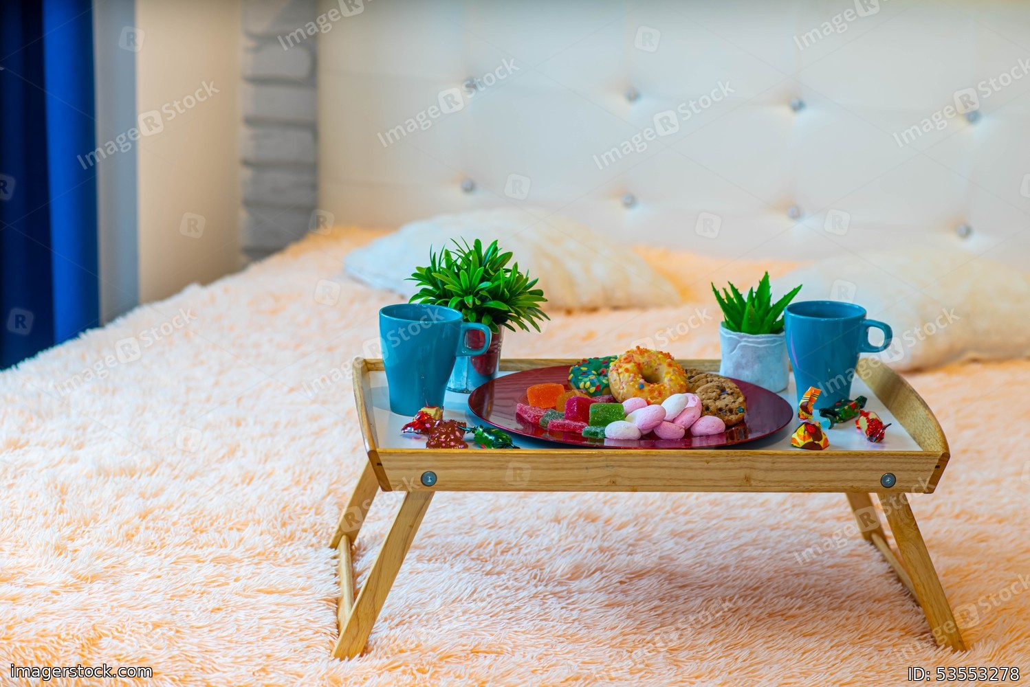 Close-up of tray with breakfast on the bed. Romantic composition. Couple of mugs, sweets and donut. Modern interior.