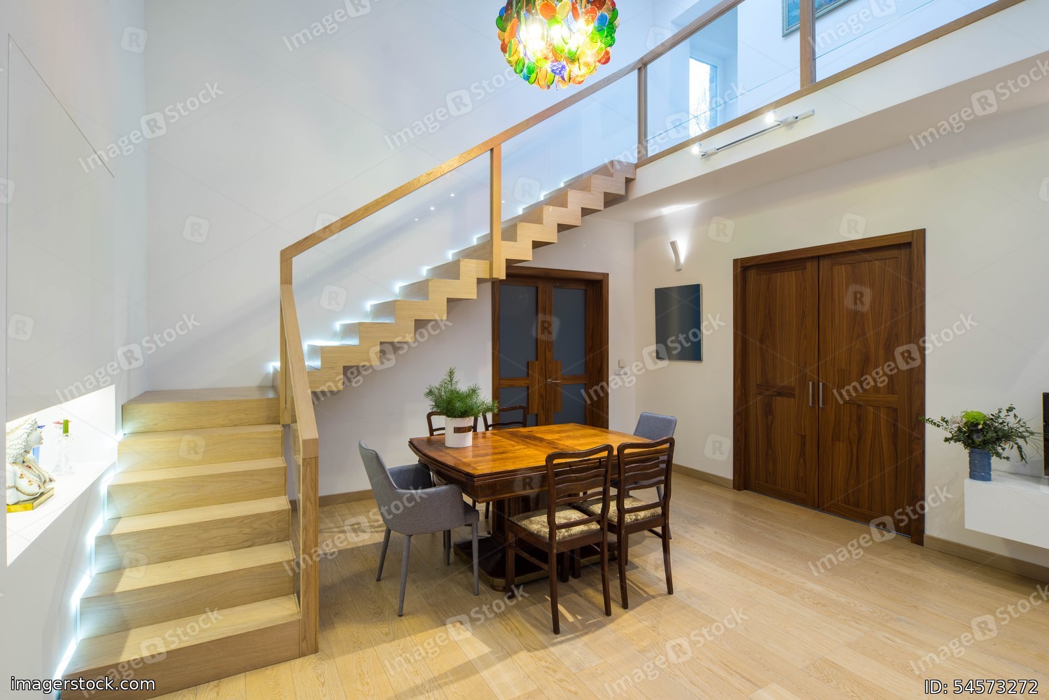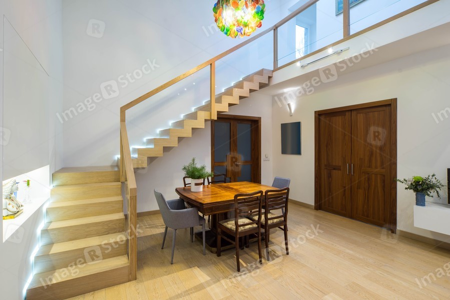 Light interior of room in private house. View of entrance door, staircase, table and chairs.