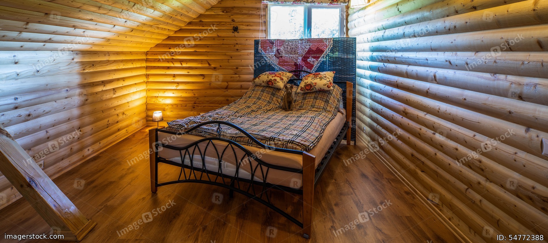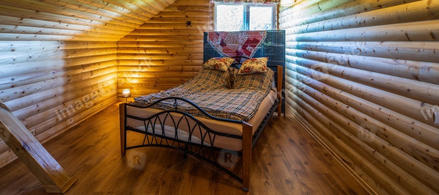 Eco wooden interior of attic bedroom in private country house. Soft cozy bed.