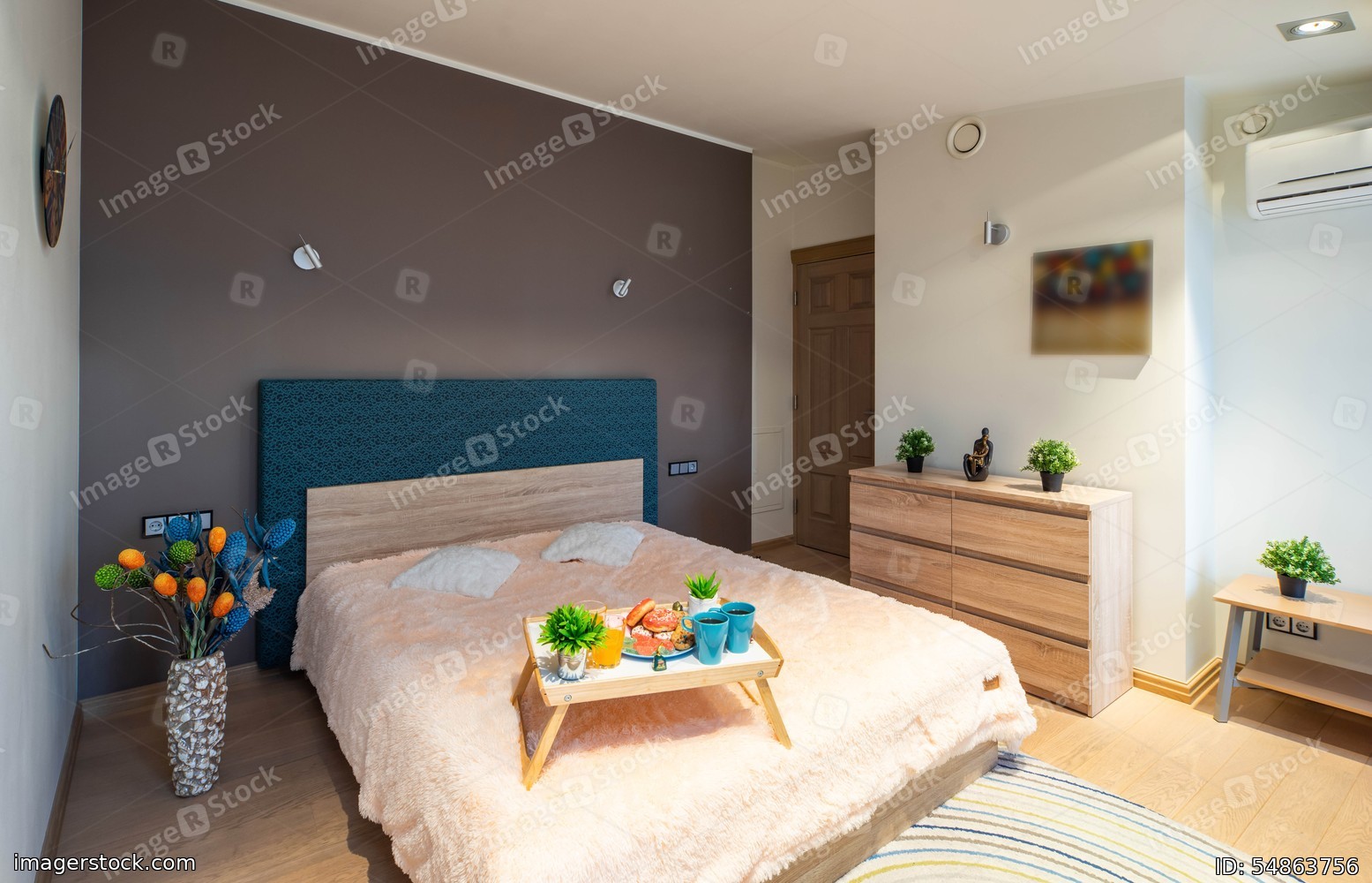 Interior of bedroom. Modern apartment. King-size bed. Tray with food.