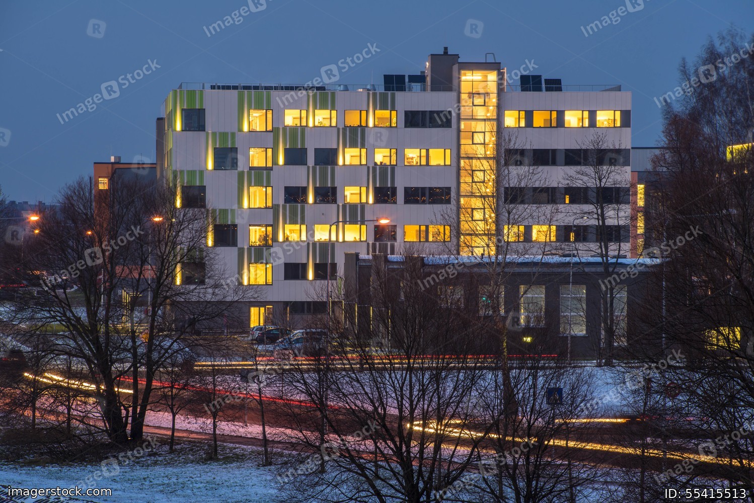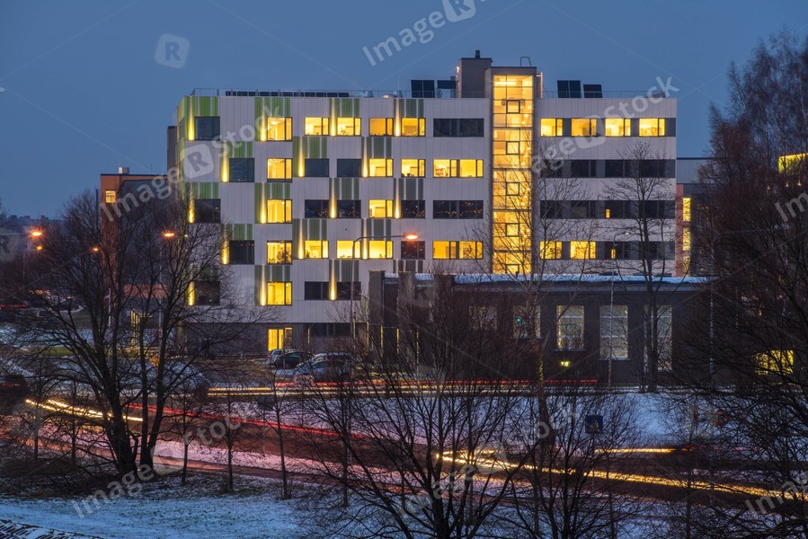 Modern design of the building. Modern architecture. Snow on the ground.