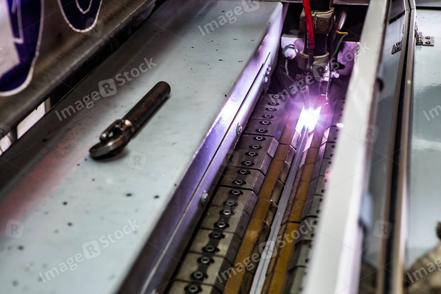 Working overlap arc welding machine. Welded seam. Welding sparks.