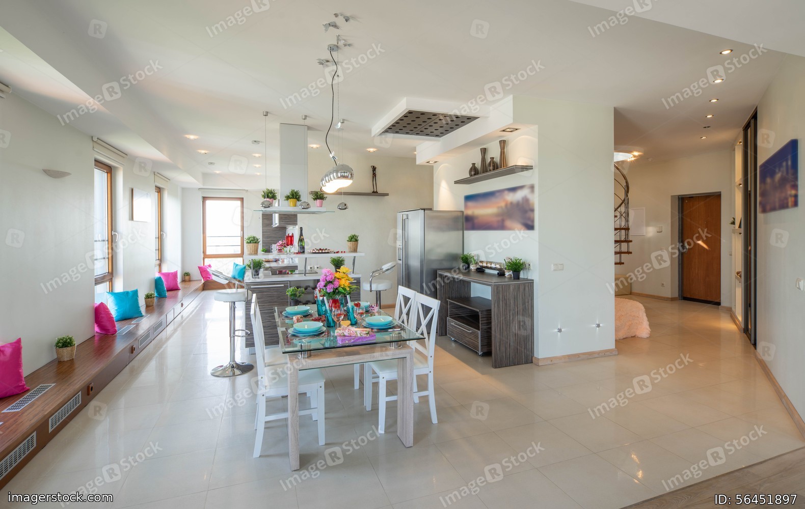 Interior of kitchen in modern studio apartment. Kitchen set and laid table. Luxury interior.