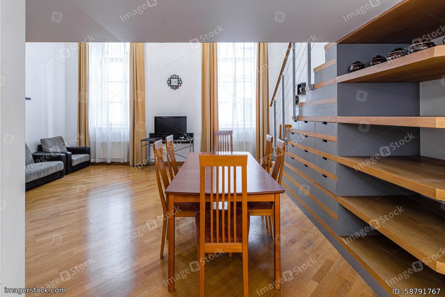 Modern light interior. Wooden furniture and shelves. Staircase. Studio apartment.