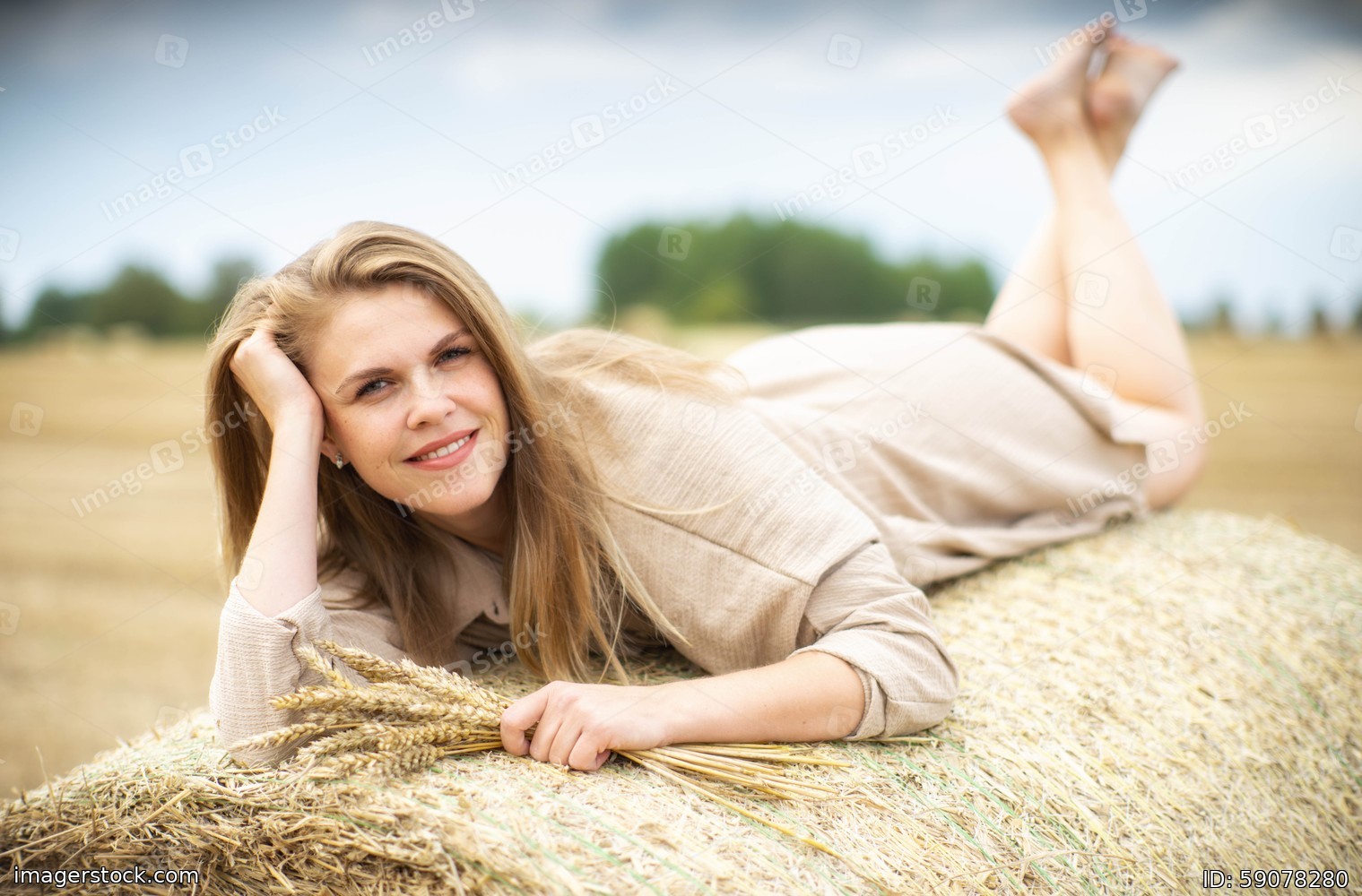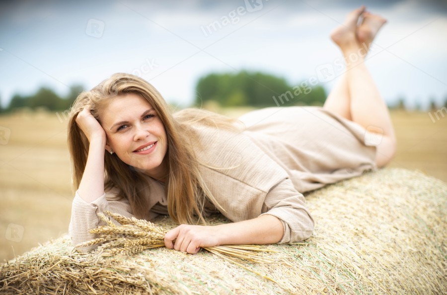 Beautiful happy woman lying on a haystack.