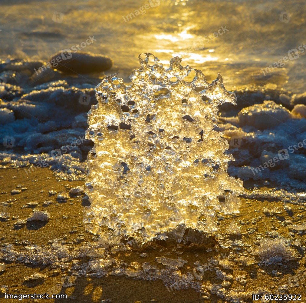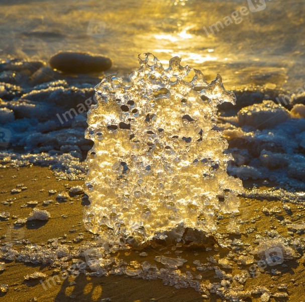 Close-up of piece of ice on snowy beach of Baltic sea at winter.