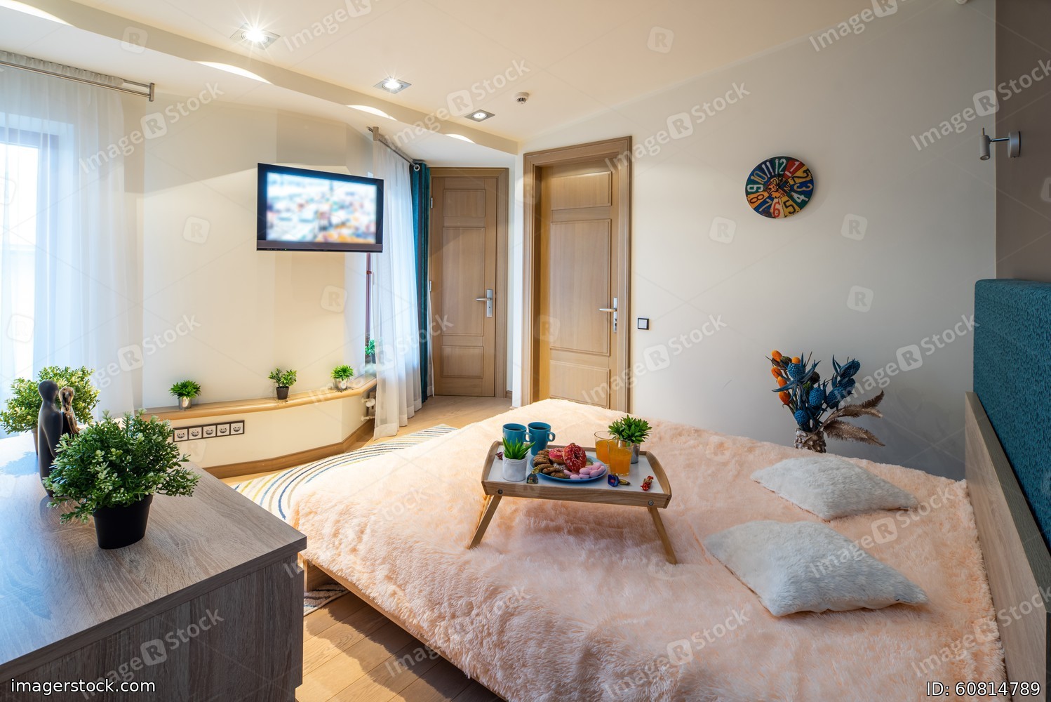 Interior of bedroom. Modern apartment. King-size bed. Tray with food.