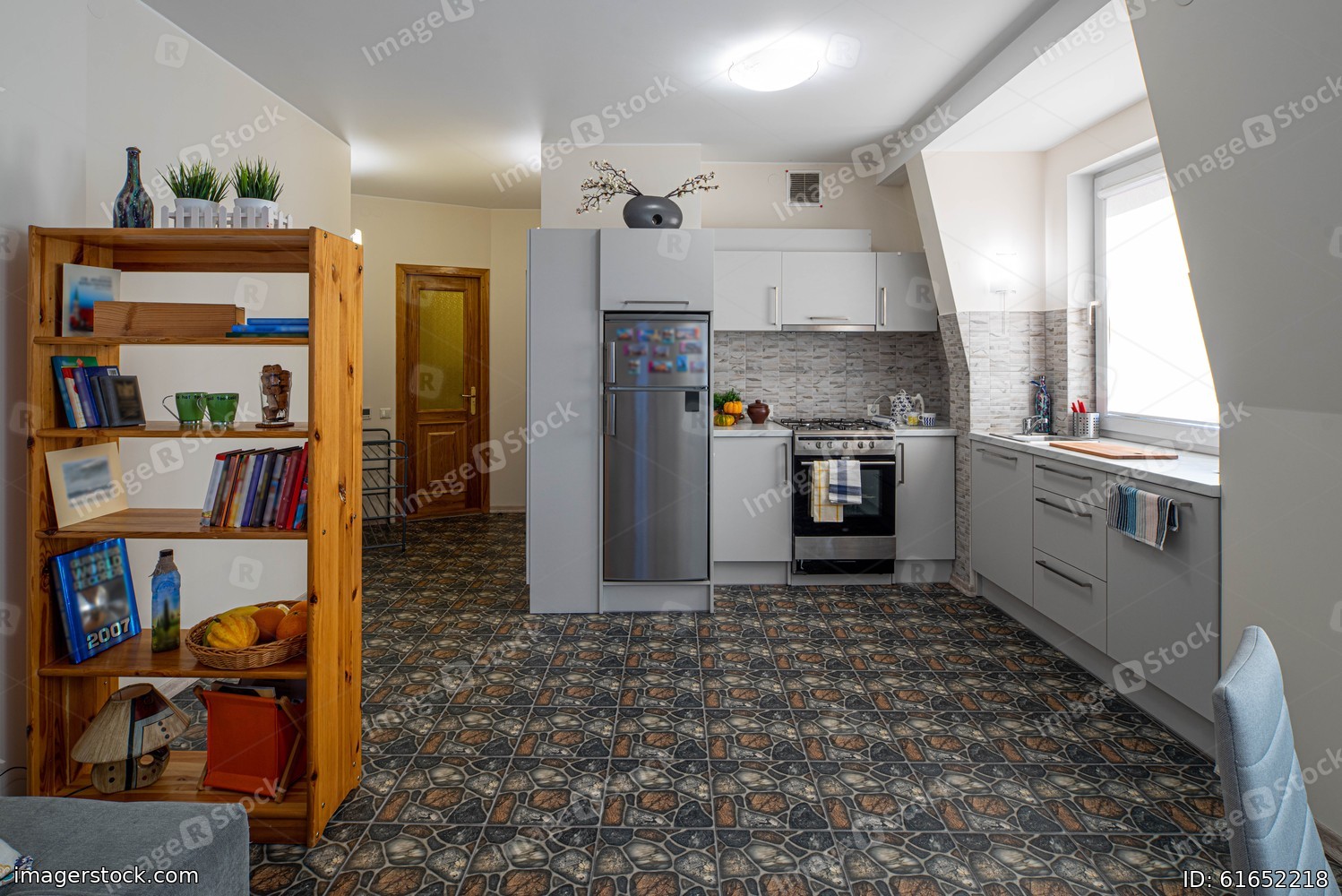 Spacious kitchen. Studio apartment. White walls. Kitchen set. Wooden bookcase.
