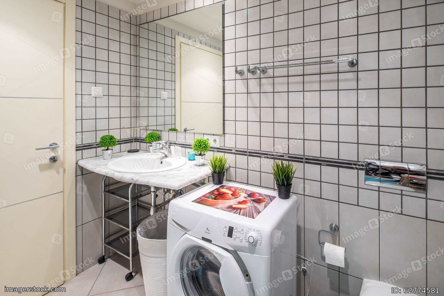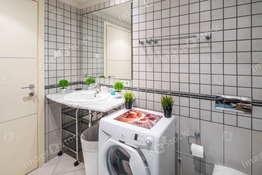 Interior of bathroom with grey tile on the walls and floor. Washing machine. Sink and flower.