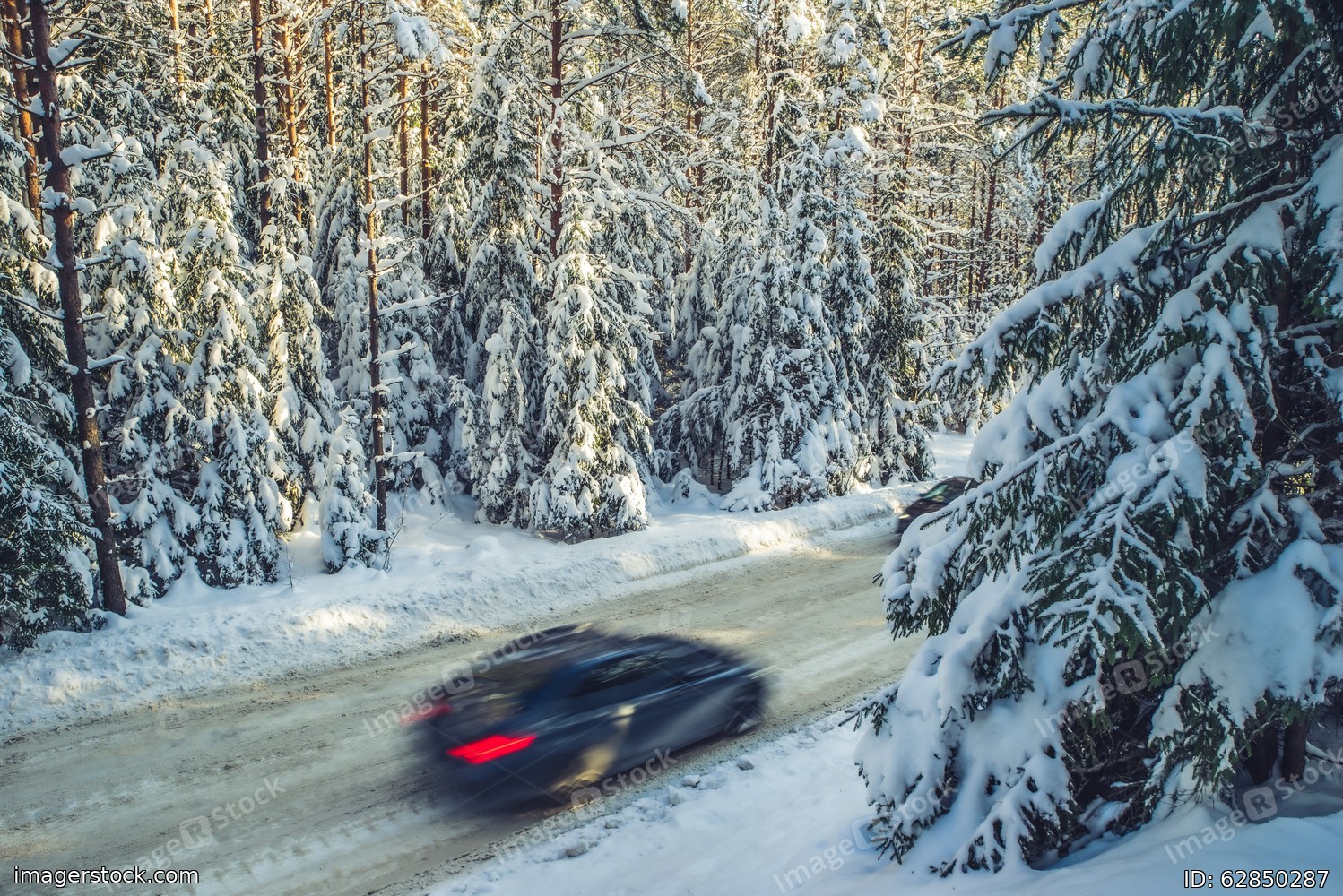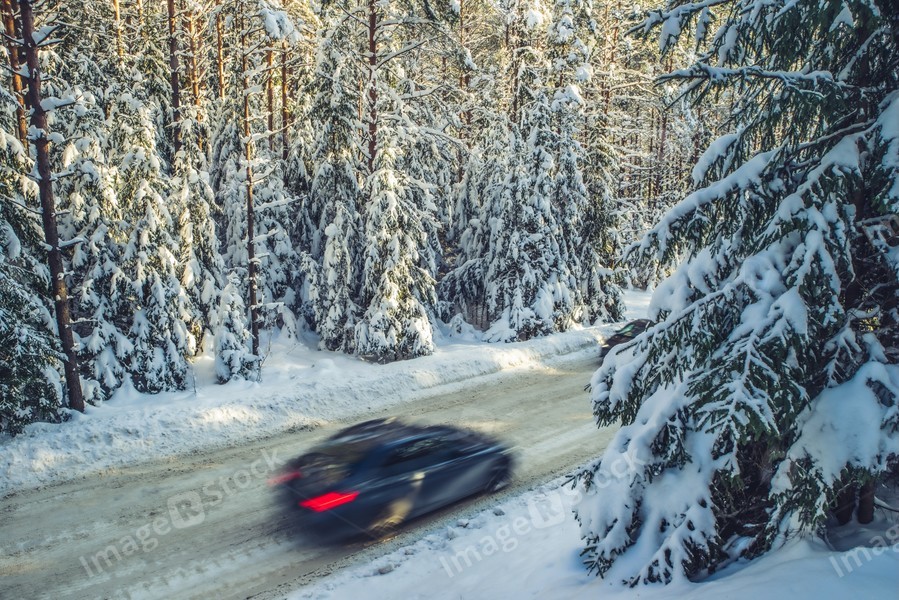 Scenic landscape of winter forest. Trees covered by snow. Car on road.