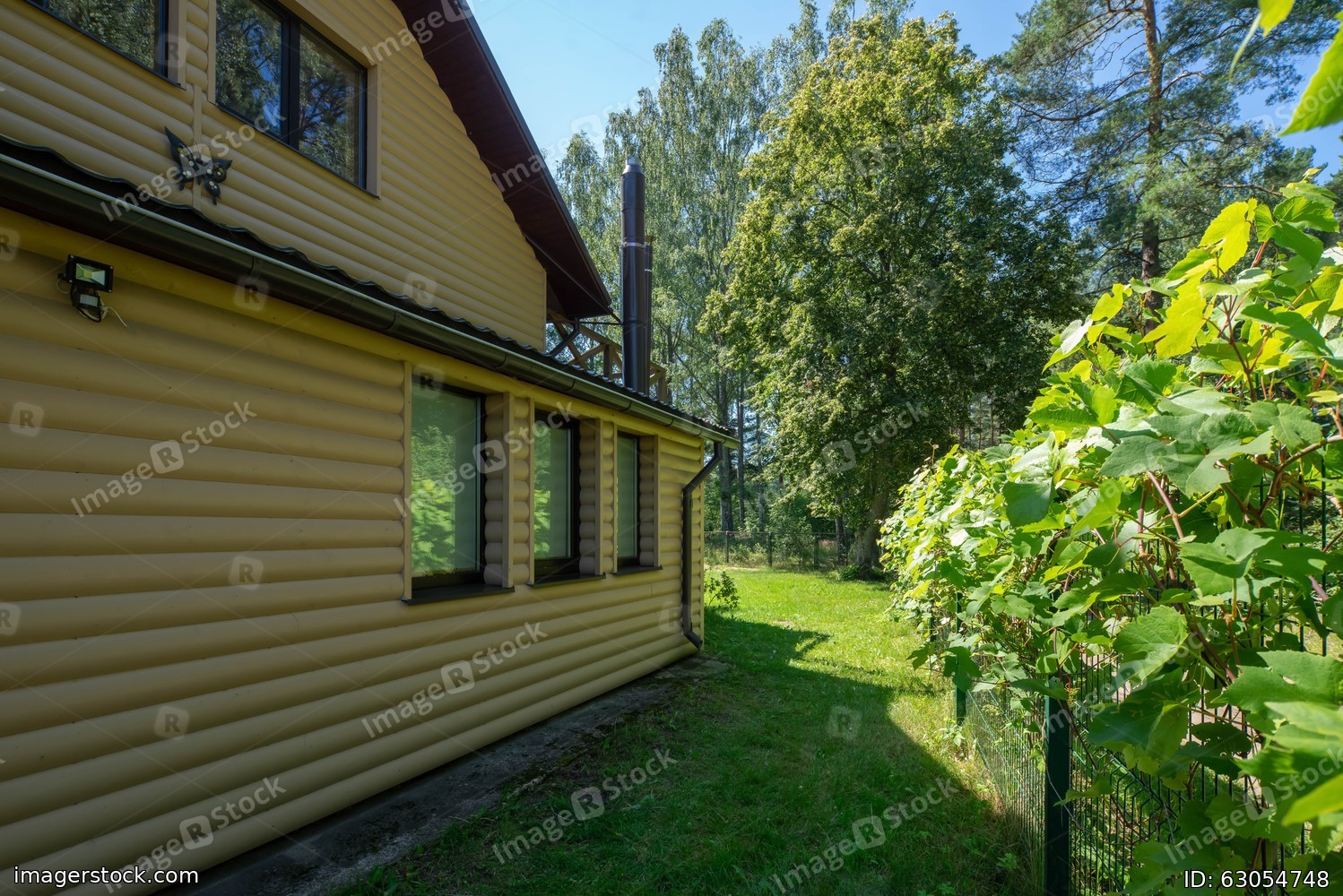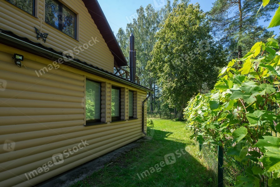 An exterior of private country house near the fores. Siding wall. Sunny summer day.