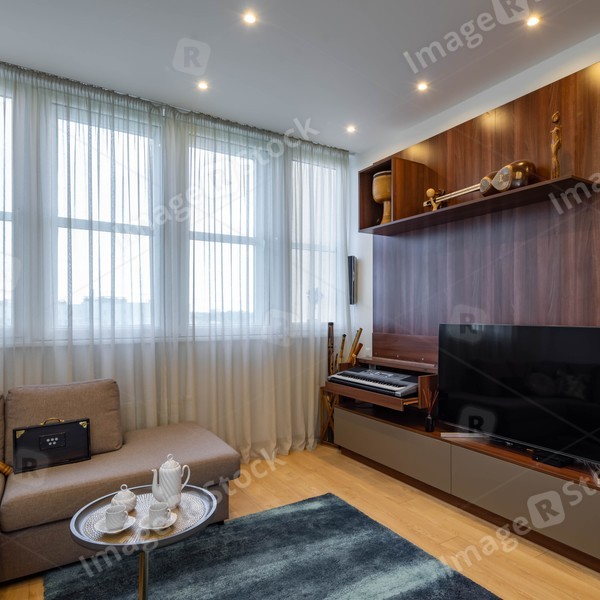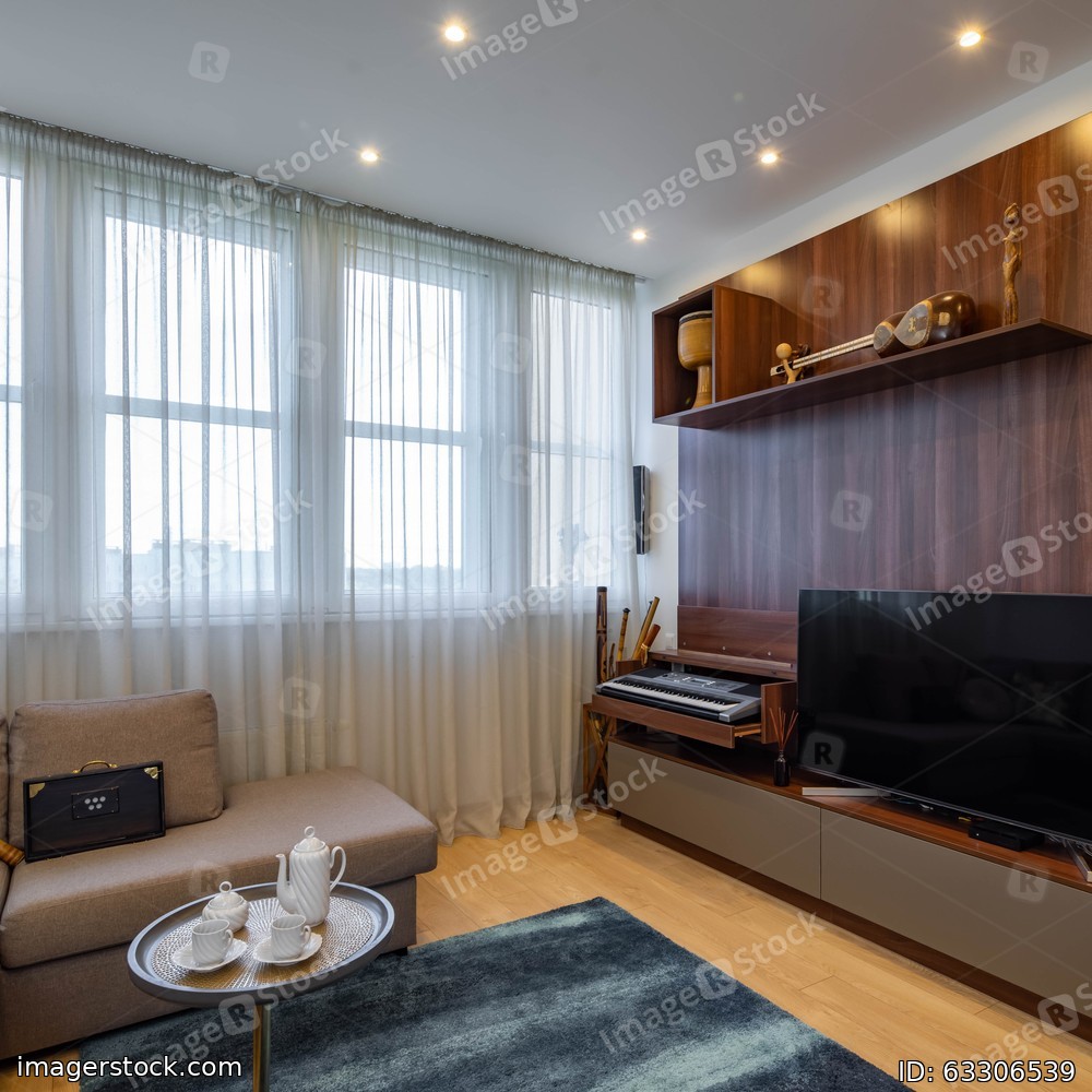 Contemporary interior of living room with cozy furniture. Window with tulle. TV on wooden wall unit. Home decor. Coffee table.