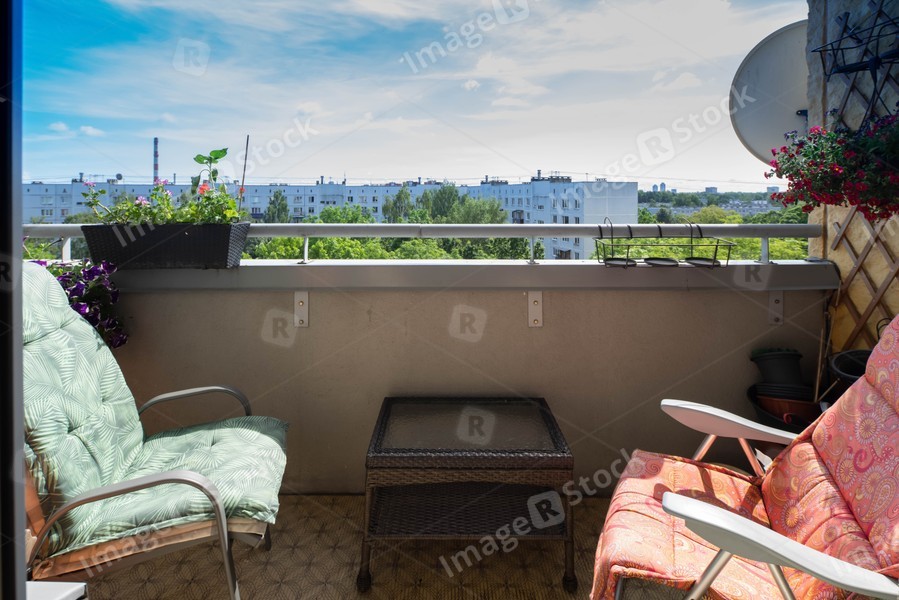 Lounge zone on balcony in modern residential complex. Chairs and table. Beautiful flowers. View of city at sunny day.