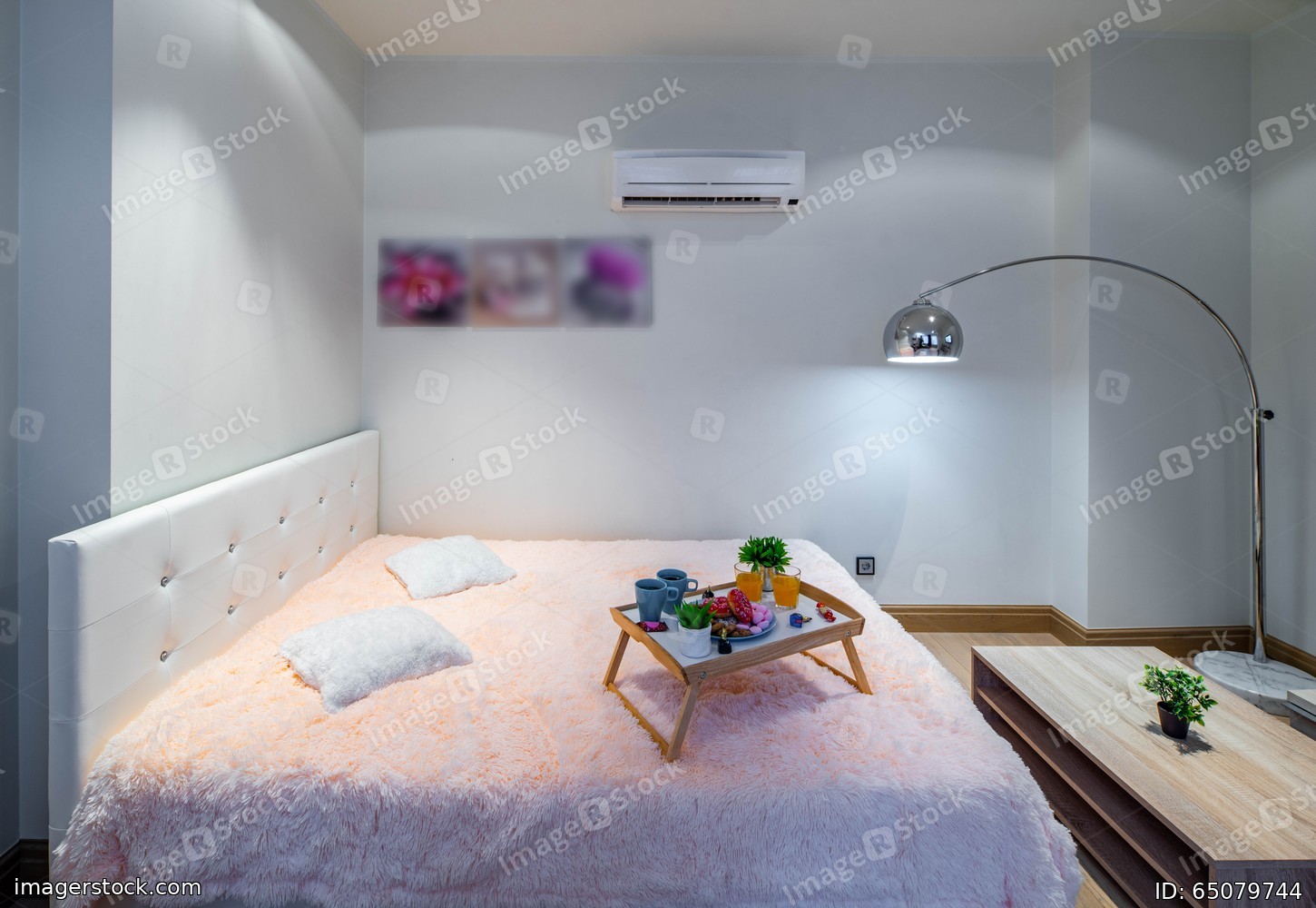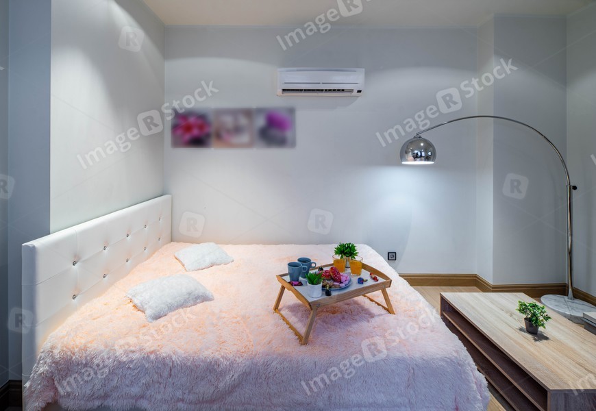 Interior of modern studio apartment. Bedroom with furniture.