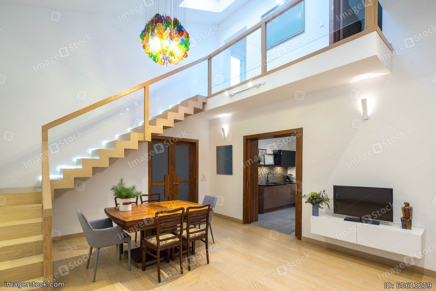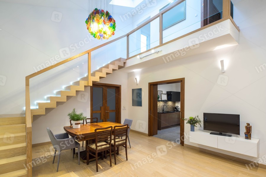 Light interior of room in private house. Opened door to the kitchen. Staircase. Table and chairs. Chandelier.