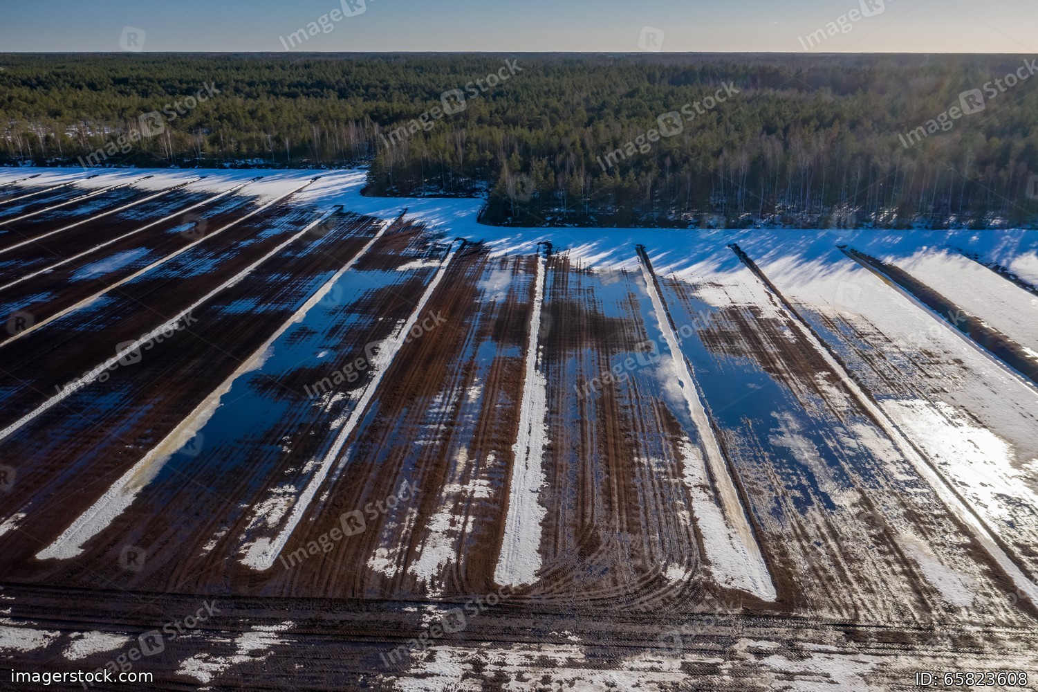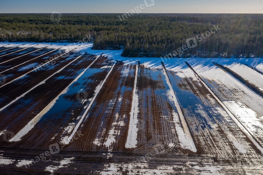 Early spring. Sunny day. Aerial view. Field with snow and puddles.