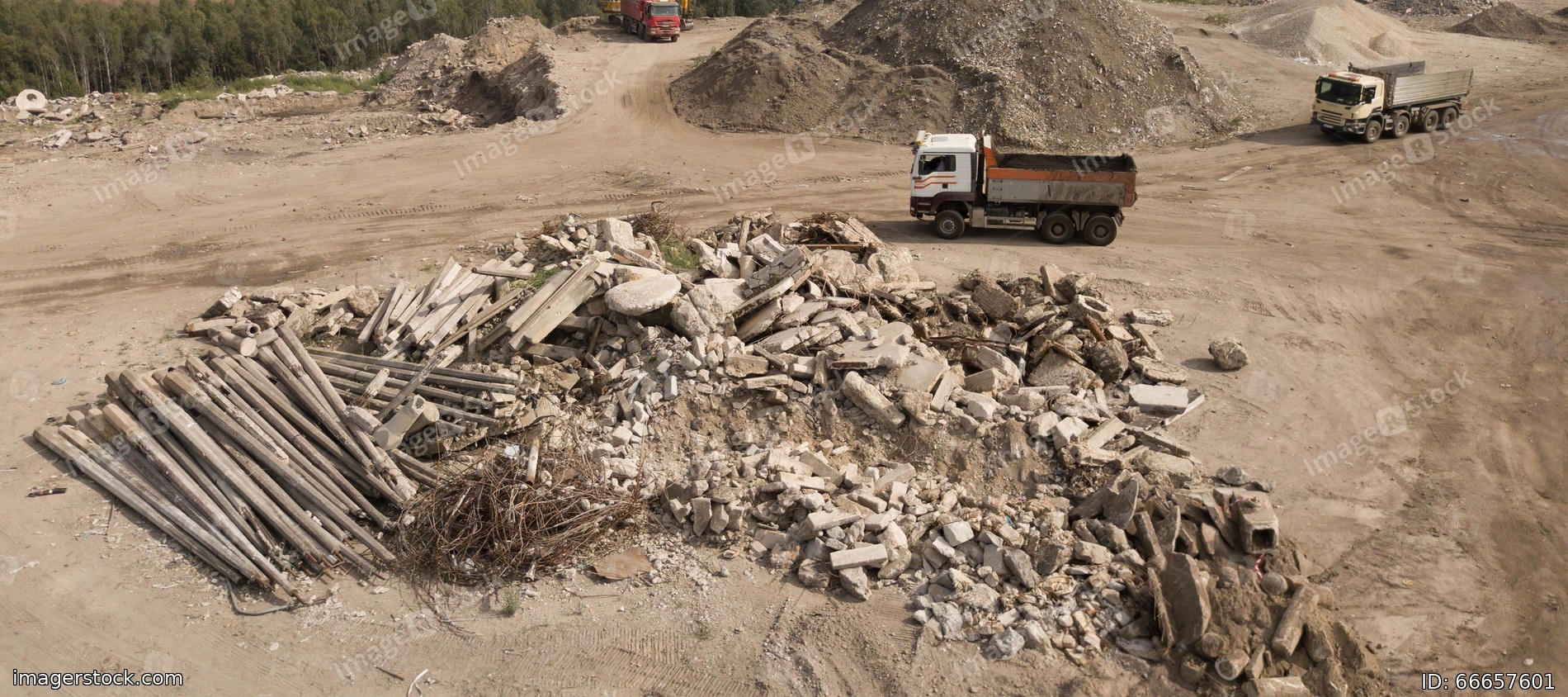 Aerial view of truck near heap of waste on construction site. Fragments of concrete, wire, and rocks.