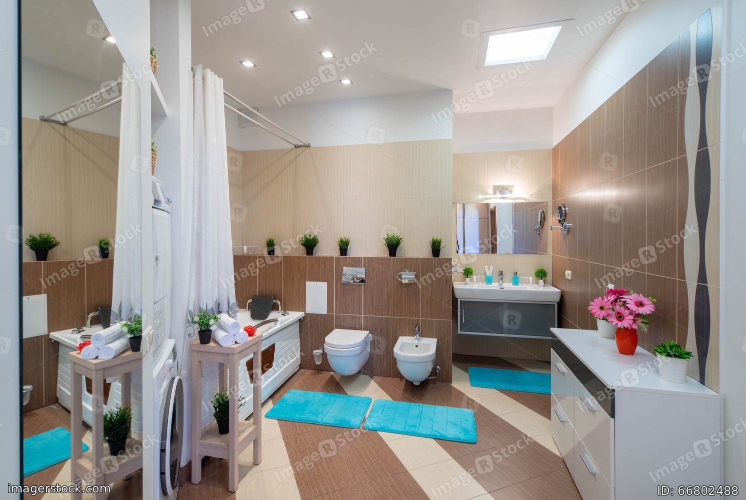 Brown and beige tile. Interior of bathroom in private house. Toilet and bath.