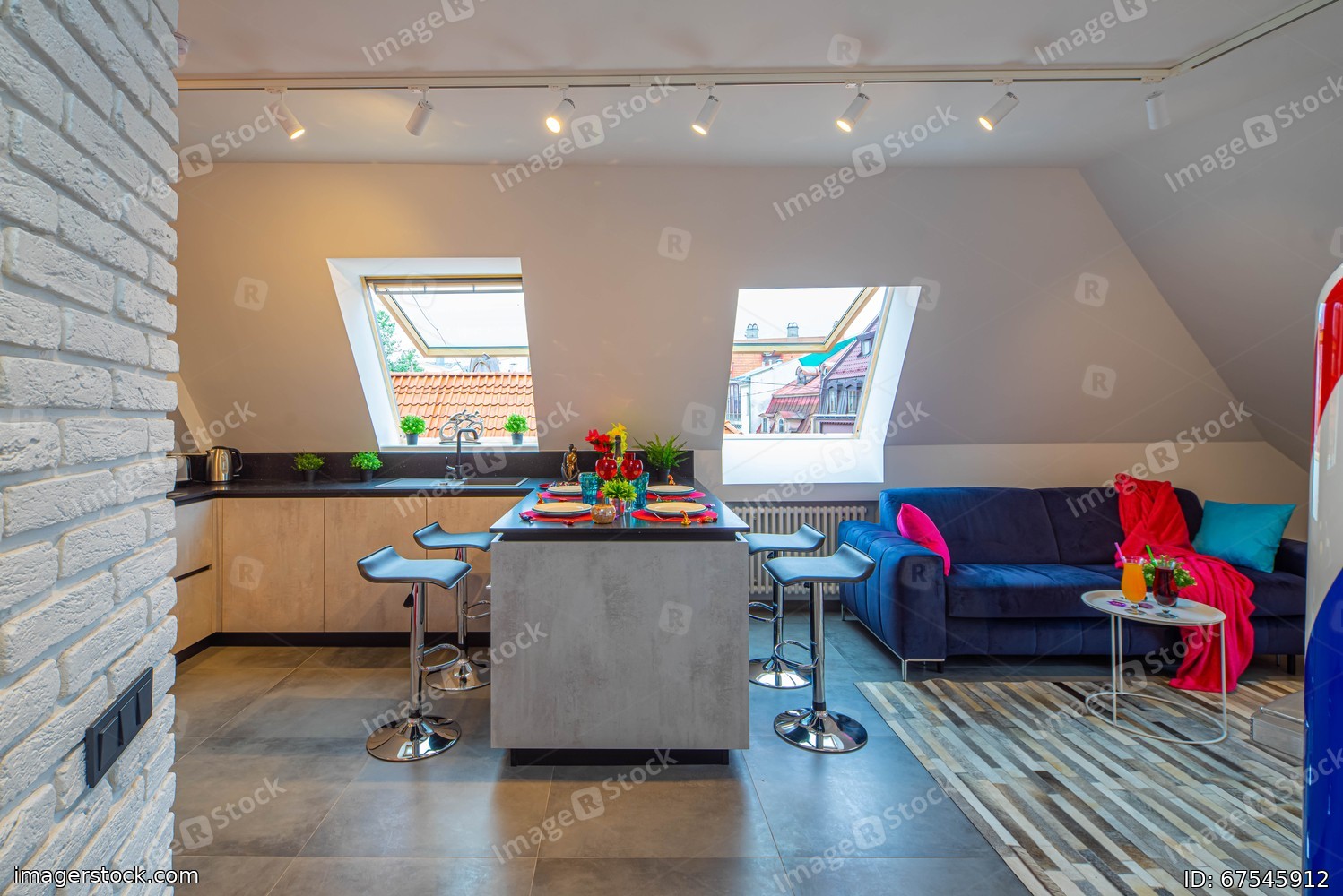 Loft interior of modern flat. Studio apartment. Set table. Cozy sofa. Roof windows. Brick wall.
