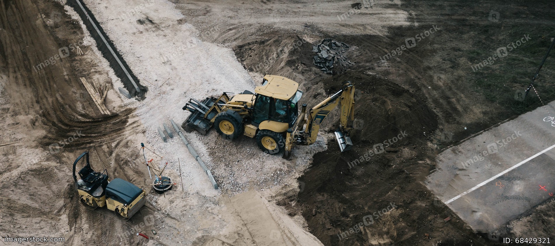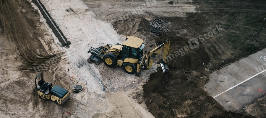 Construction site of new road. Heavy excavator and road roller. Pedestrian and bicycle asphalt road. Top drone view.