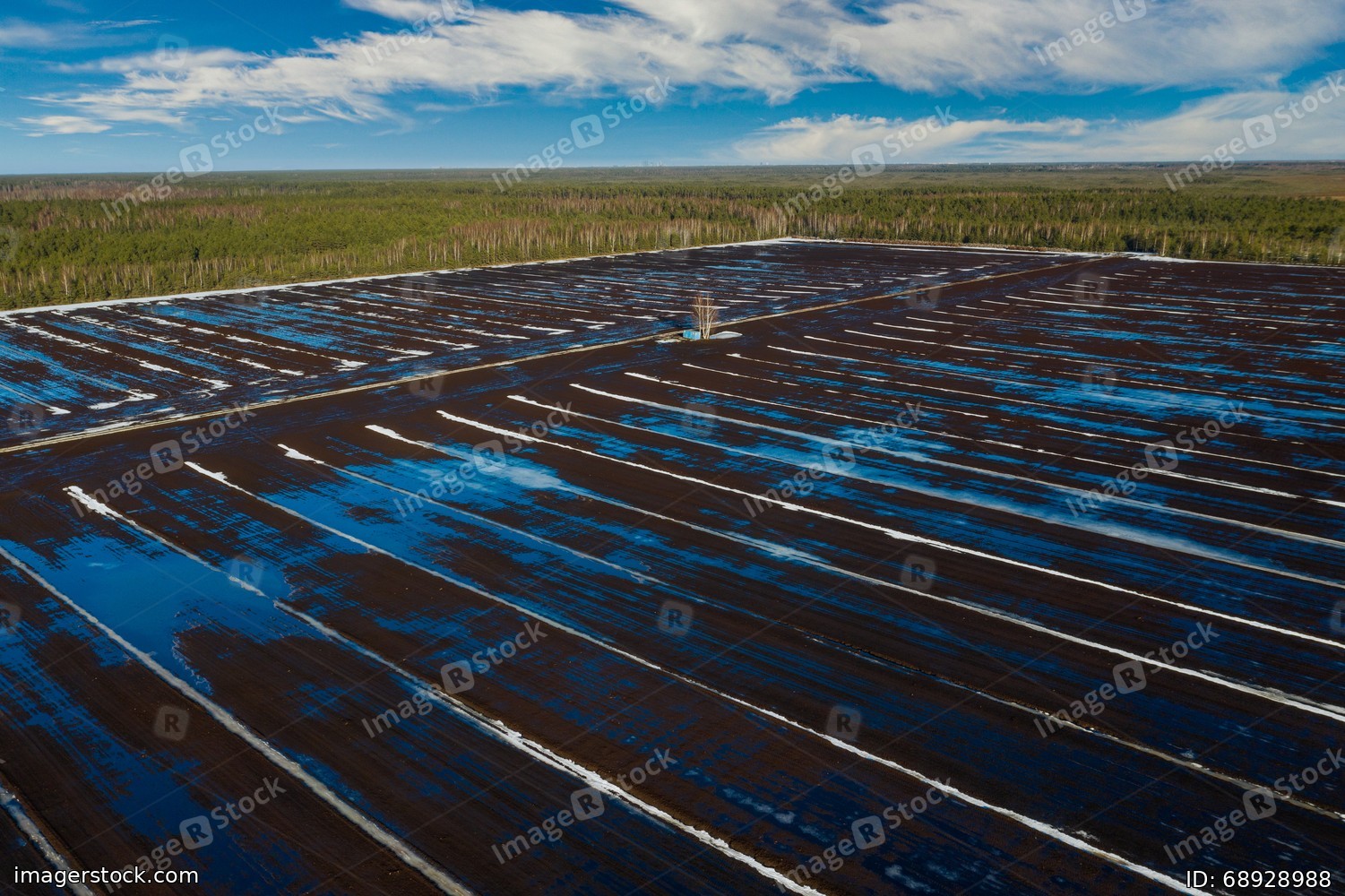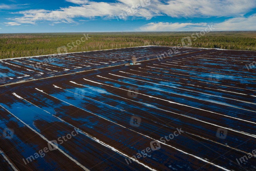 Early spring. Sunny day. Aerial view. Field with snow and puddles.