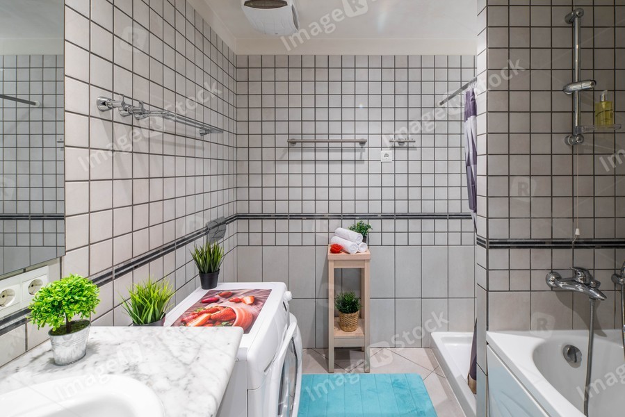 Interior of bathroom with grey tile on the walls and floor. Washing machine. Green flowers.