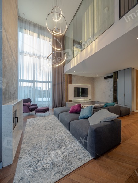 Luxury interior of flat. Living room with huge sofa. Modern design.