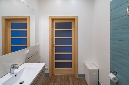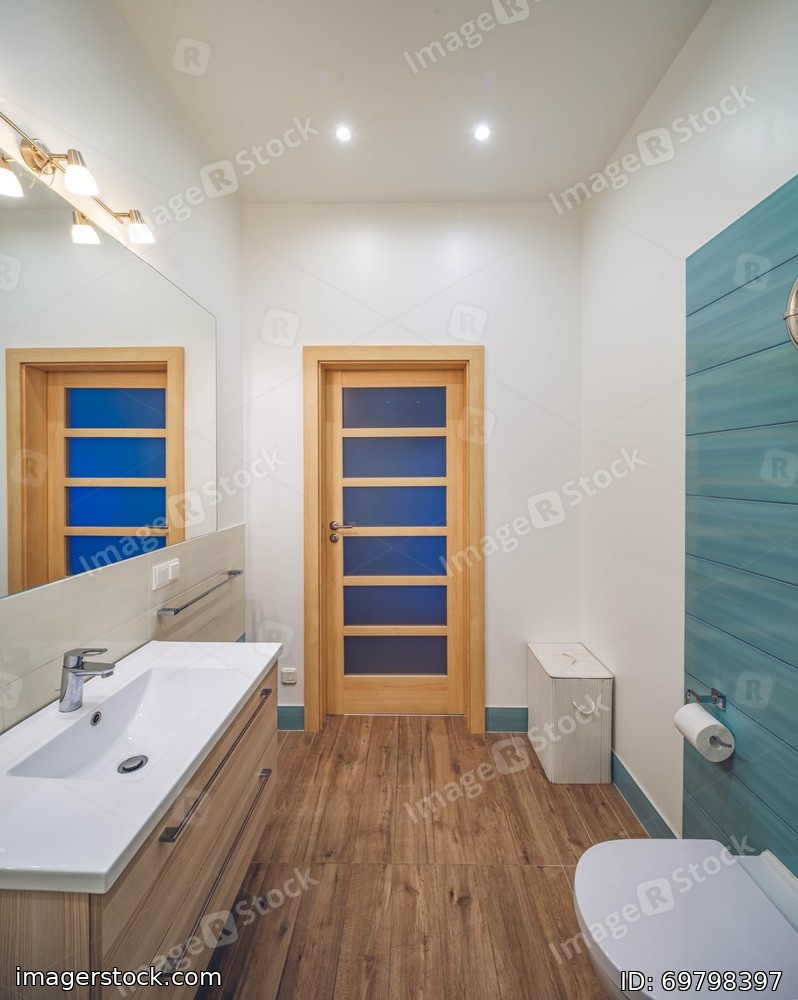 Modern interior of luxury bathroom. Wooden door. White wall. Sink and mirror. Blue tile. WC toilet.