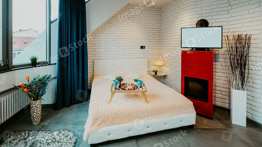 Loft interior of flat. Studio apartment. Panorama windows. Brick wall. Cozy bed with tray. TV on the modern fireplace. Front view.