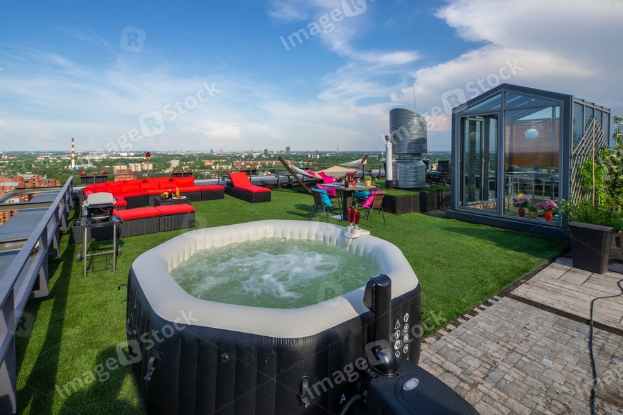 Relaxing zone on the rooftop with furniture and jacuzzi. Veiw of city from the top.