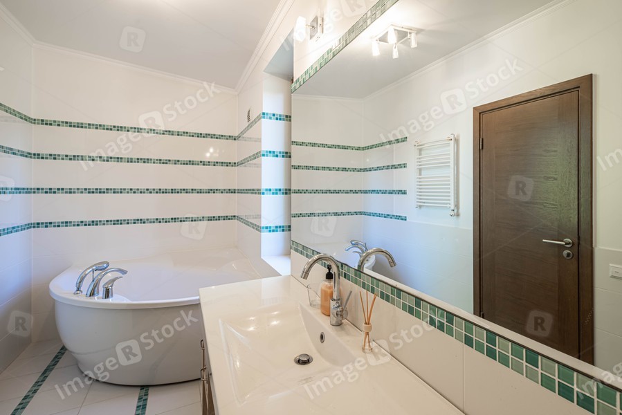 Modern interior of luxury bedroom in private house. Huge bath. Wooden door. White sink and mirror.