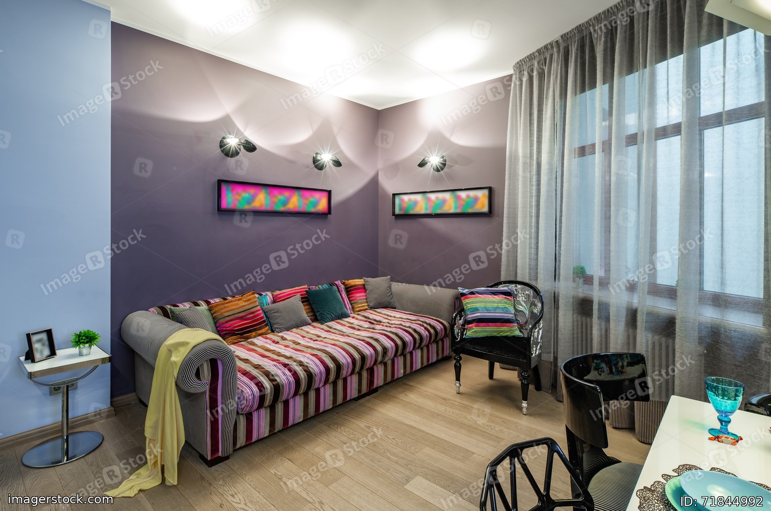 Studio apartment. Living room. Cozy sofa with pillows.