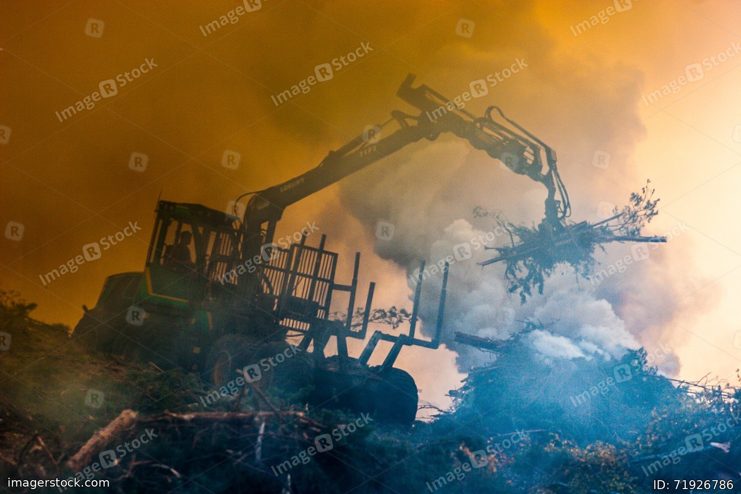 Forest cutting, burning of forest waste. Smoke and fire, tractor.