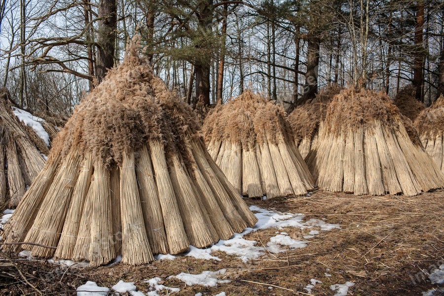 Harvesting cane for making roofs. Winter landscape.