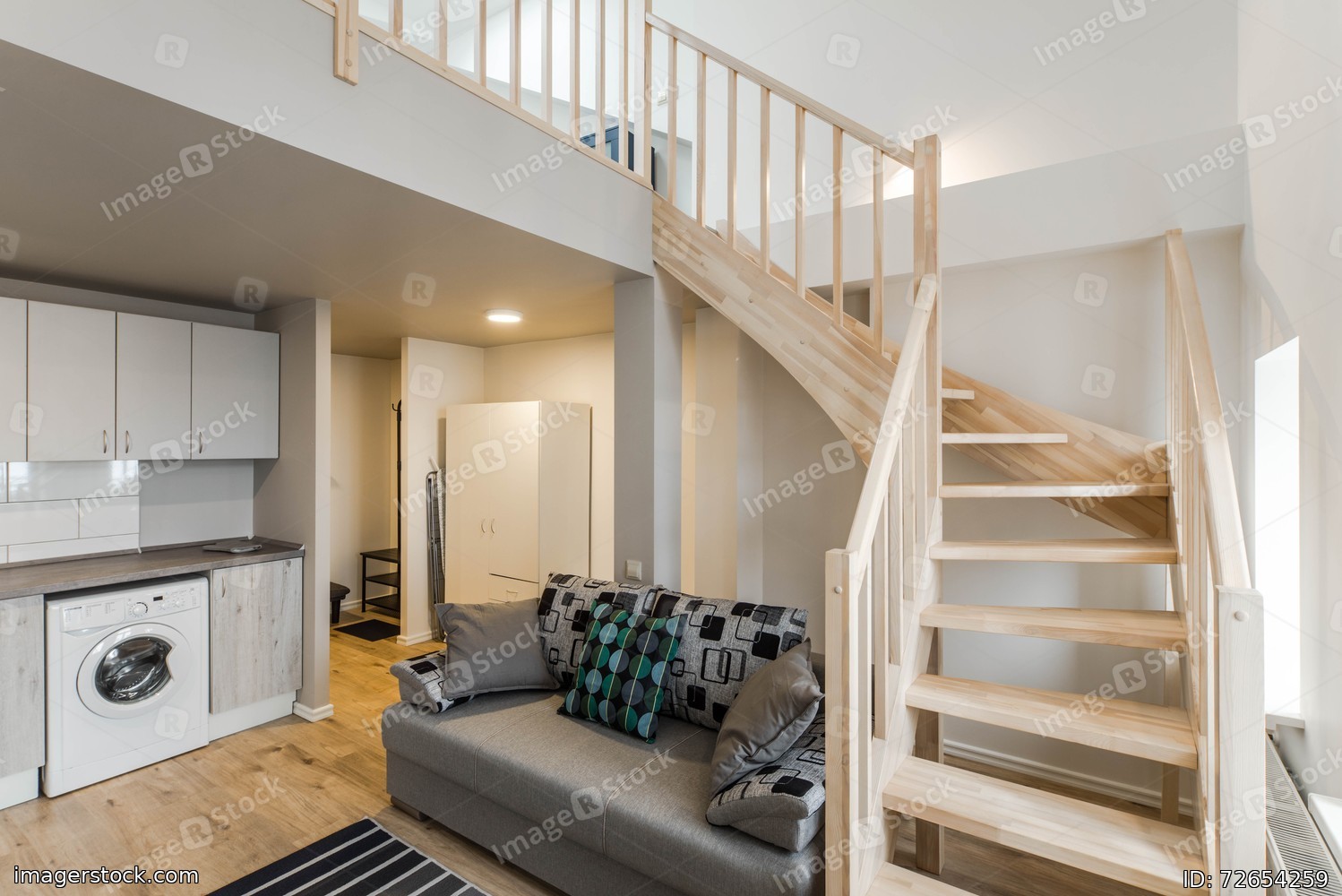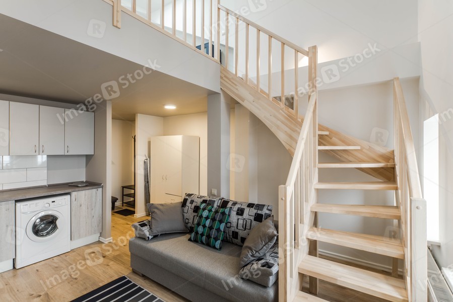 Light interior of room in apartment. Private house. Living room and kitchen.
