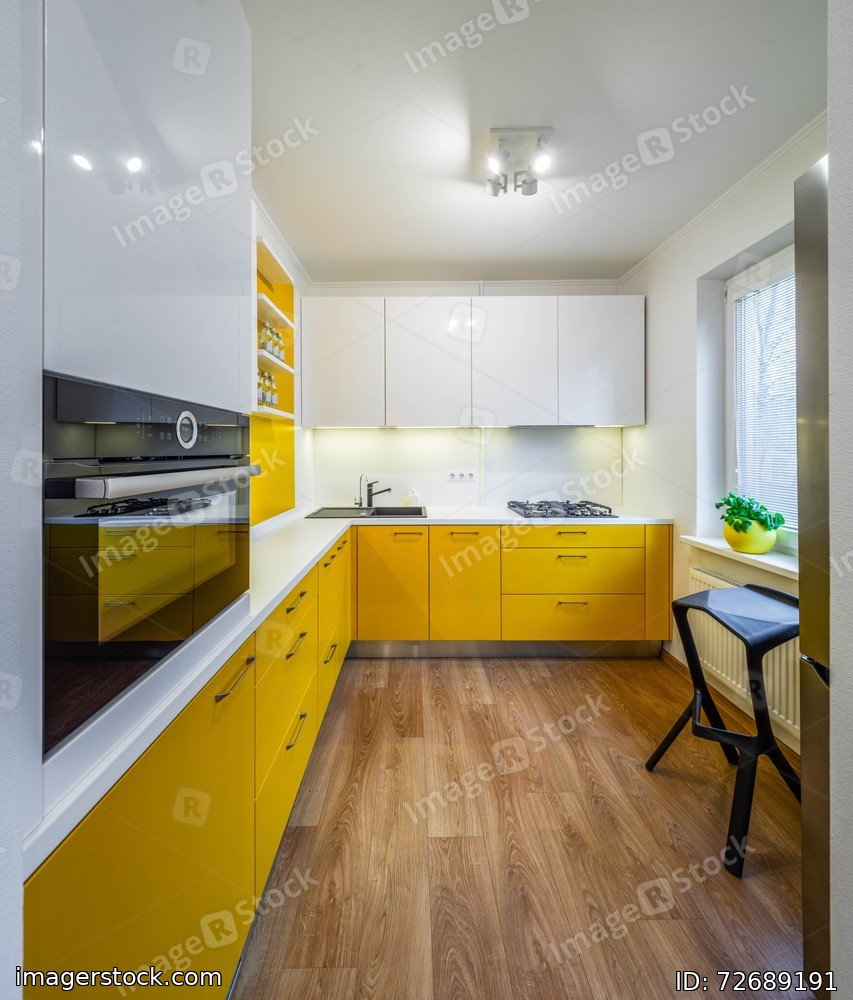 Modern interior of kitchen in luxury apartment. Yellow kitchen set with white counter. Black sink. Gas stove. Oven. Cabinets and drawers.