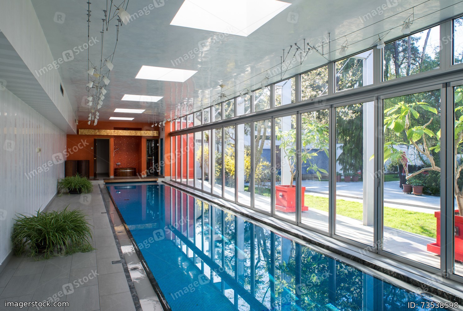 Modern interior of luxury private house. Swimming pull in cottage.