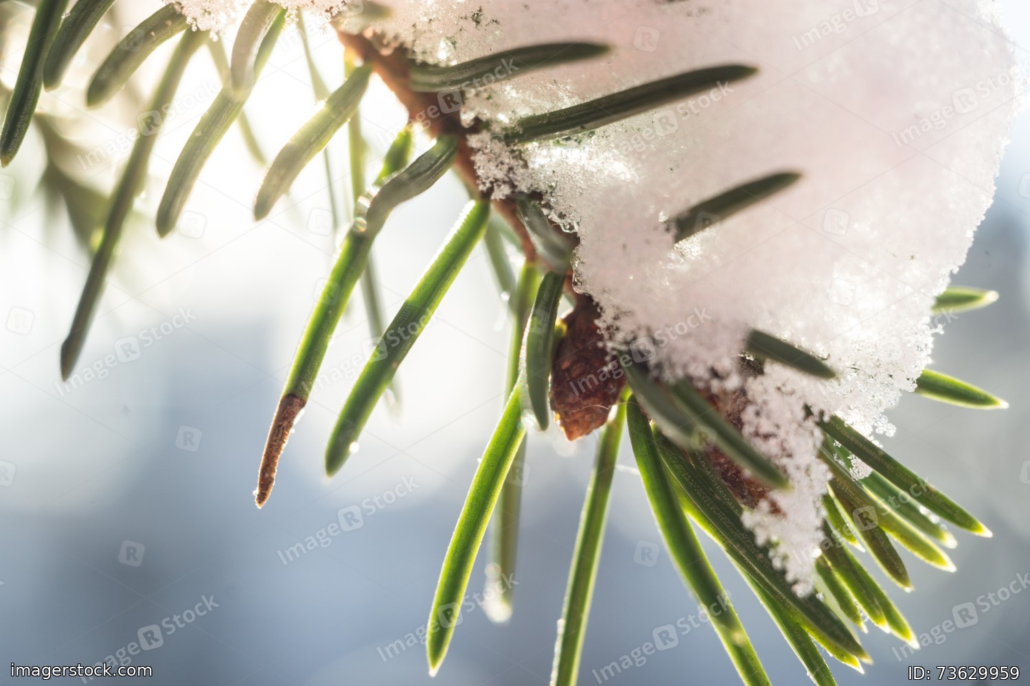 Fir-tree branch with a hat of snow on sunny winter day