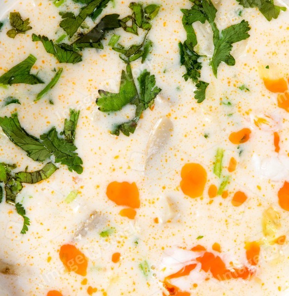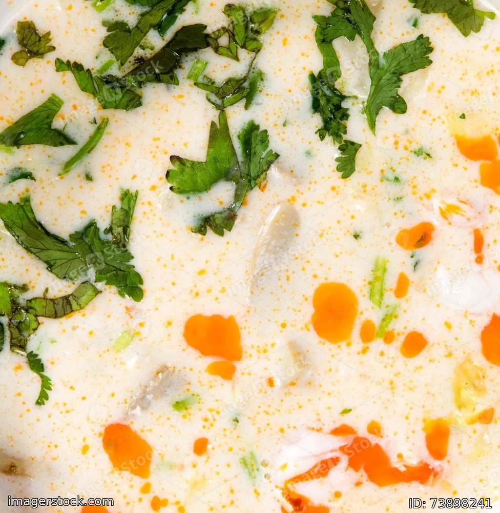 Close-up of a delicious cheese soup with herbs. Tasty food.