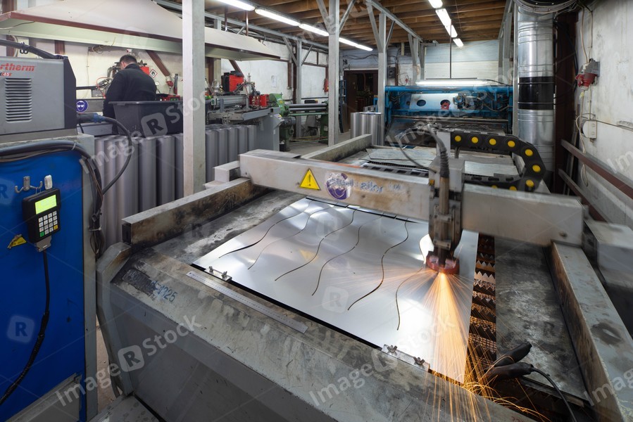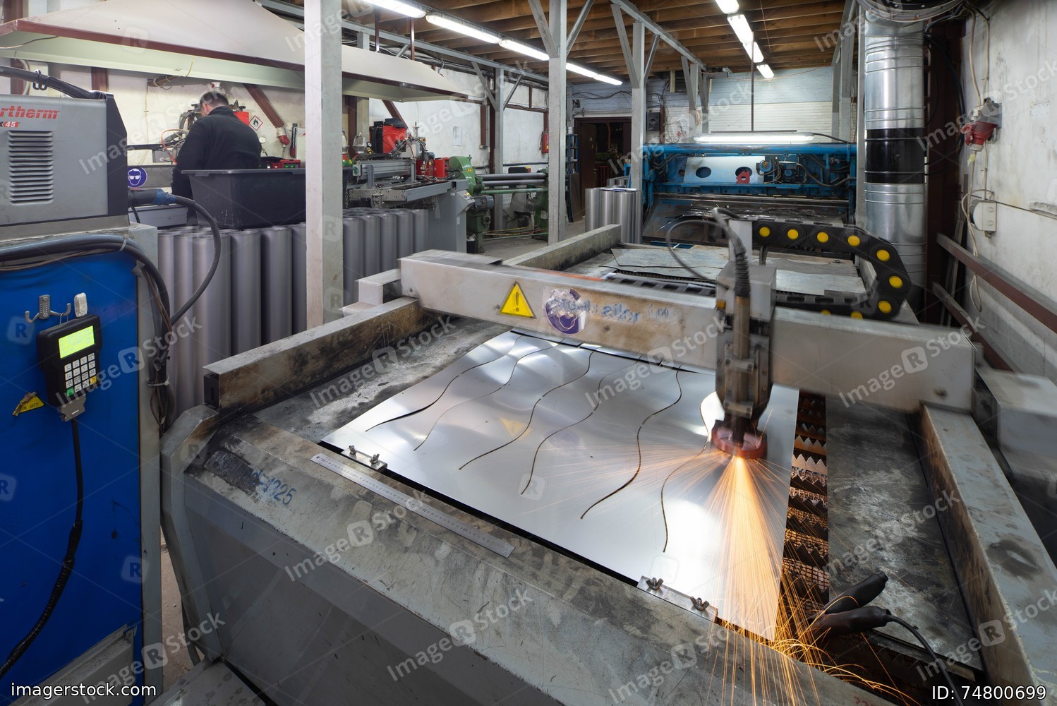 Plasma cutting of metal. View of working machine with sheet of metal. Metalworking.